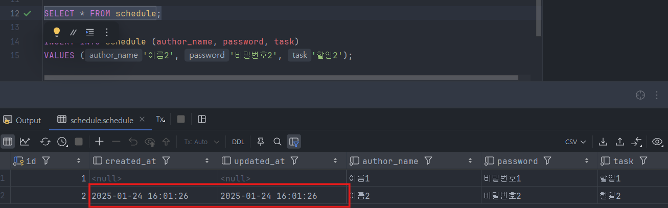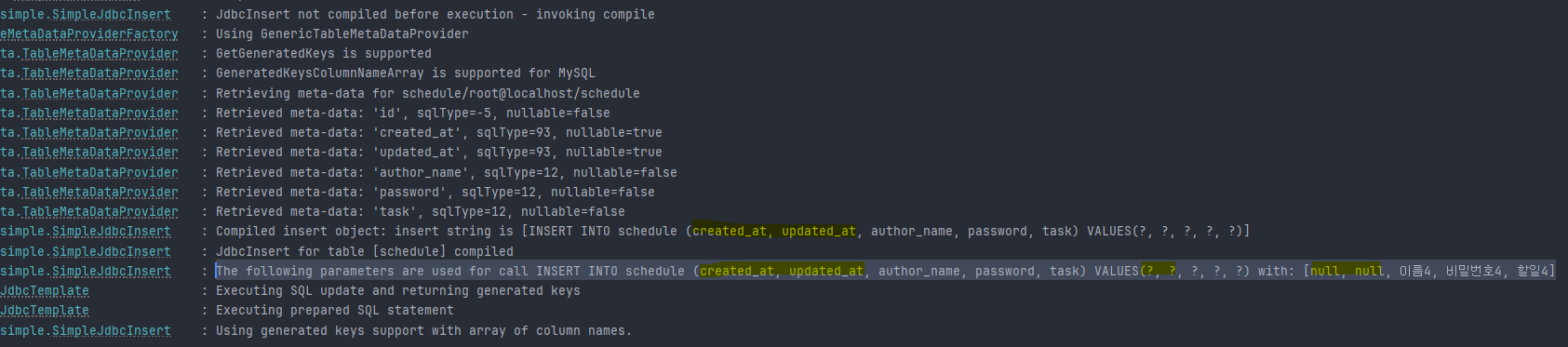 SQL 실행 로그를 보니, created_at과 updated_at 컬럼도 null값으로 insert가 되고있는걸 확인했습니다.
