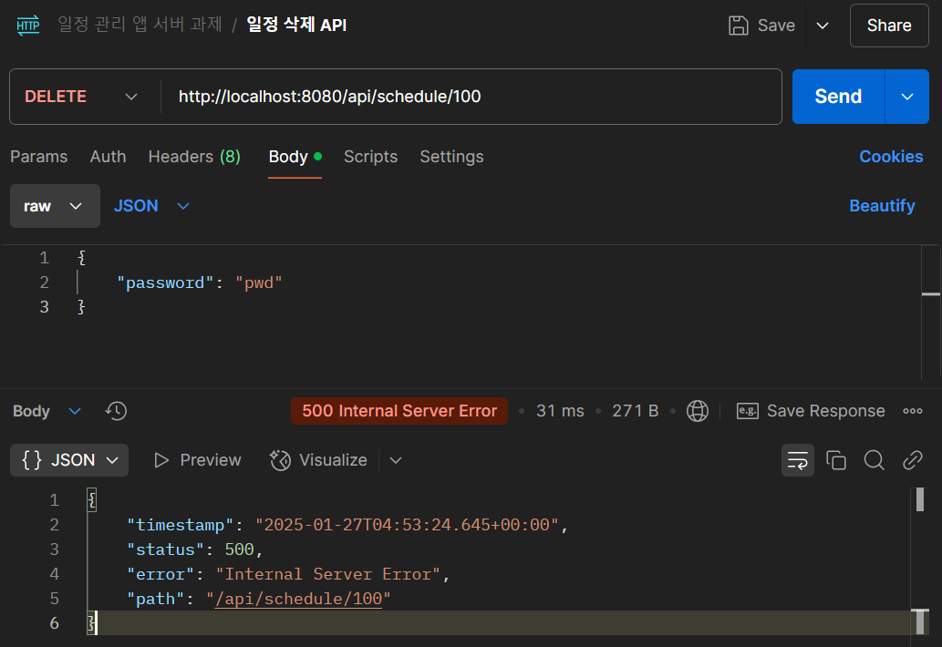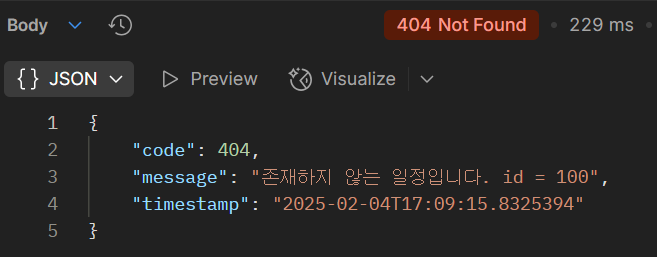 - 일정 조회 시 존재하지 않은 ID로 요청하면 발생하도록 구현했습니다.
