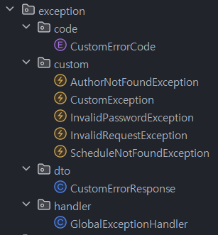 - CustomException을 상속받아 InvalidPasswordException, ScheduleNotFoundException 등의 사용자 정의 예외를 정의했습니다.