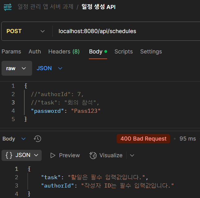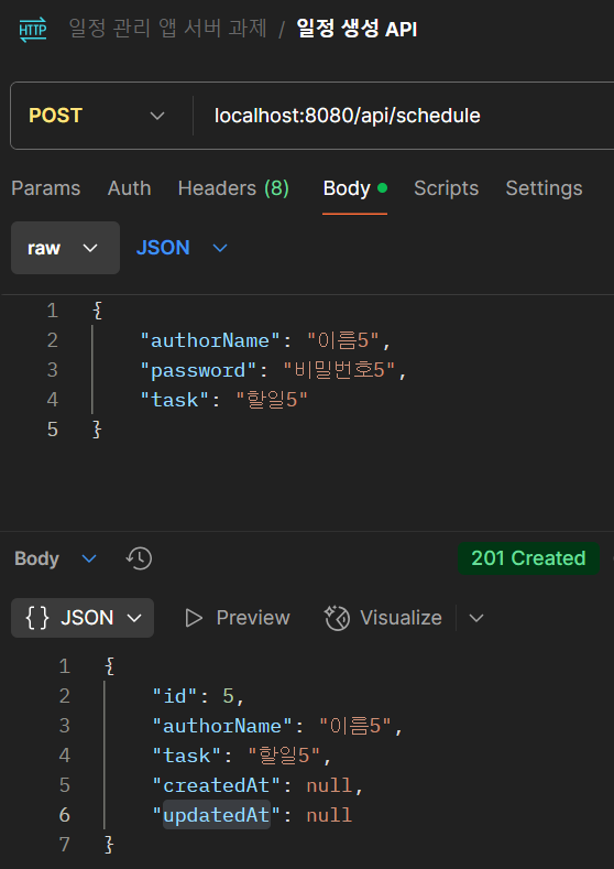 Postman에서 일정 생성 API를 테스트를 했습니다.