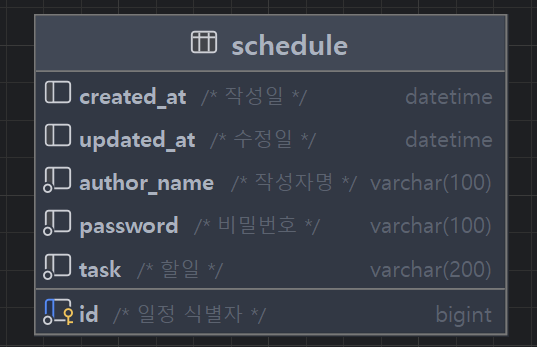일정을 저장할 테이블을 다음과 같은 구조로 생성했습니다.