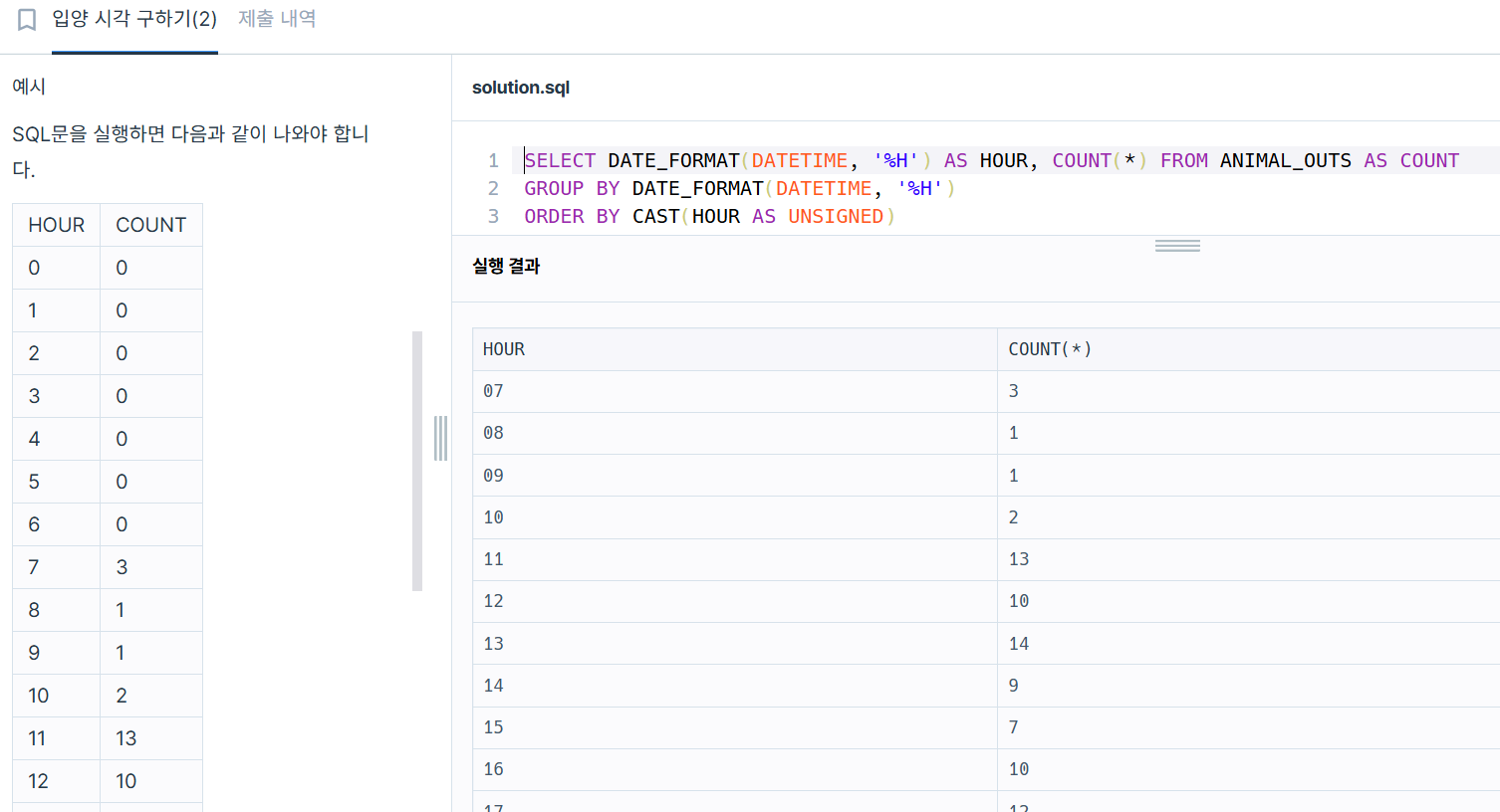 SELECT DATE_FORMAT(DATETIME, '%H') AS HOUR, COUNT(*) FROM ANIMAL_OUTS AS COUNT