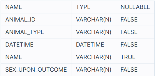 ANIMAL_OUTS 테이블은 동물 보호소에서 입양 보낸 동물의 정보를 담은 테이블입니다. ANIMAL_OUTS 테이블 구조는 다음과 같으며, ANIMAL_ID, ANIMAL_TYPE, DATETIME, NAME, SEX_UPON_OUTCOME는 각각 동물의 아이디, 생물 종, 입양일, 이름, 성별 및 중성화 여부를 나타냅니다.