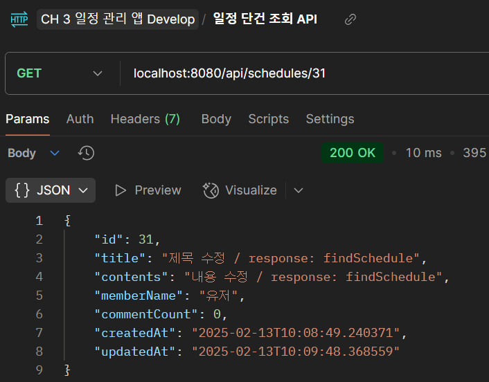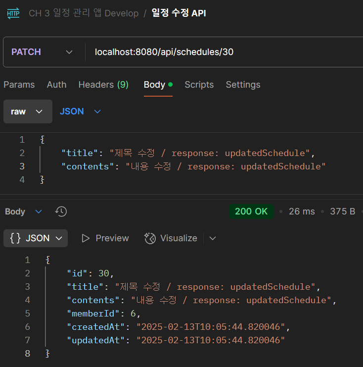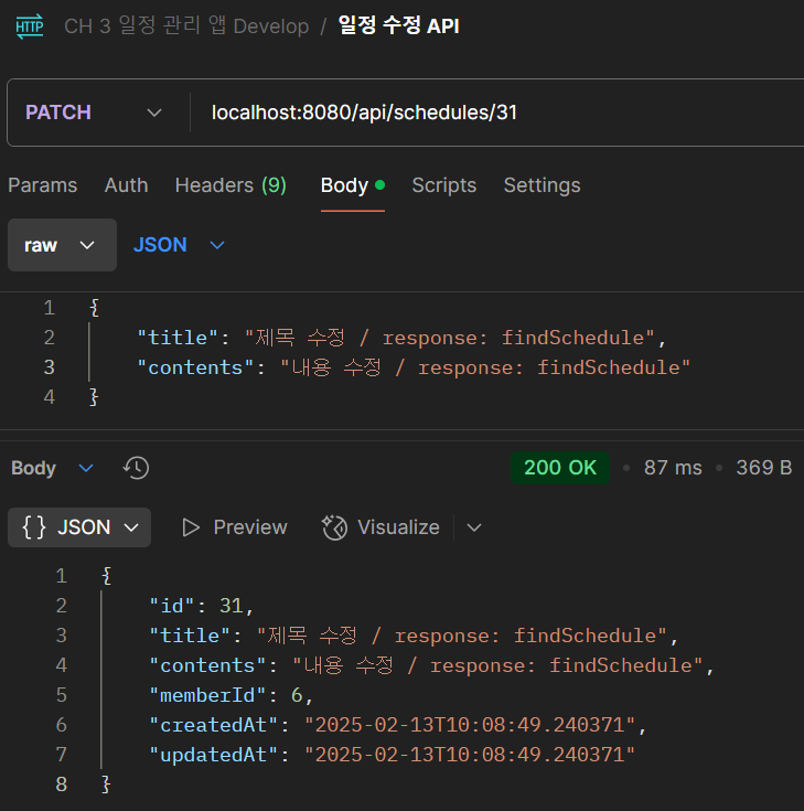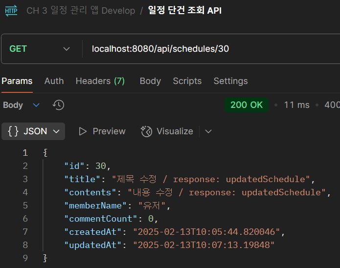 Schedule 엔티티에 updateSchedule 메서드를 호출해서, 제목과 내용을 변경하고, 변경된 엔티티를 다시 조회하여 응답하도록 했습니다.