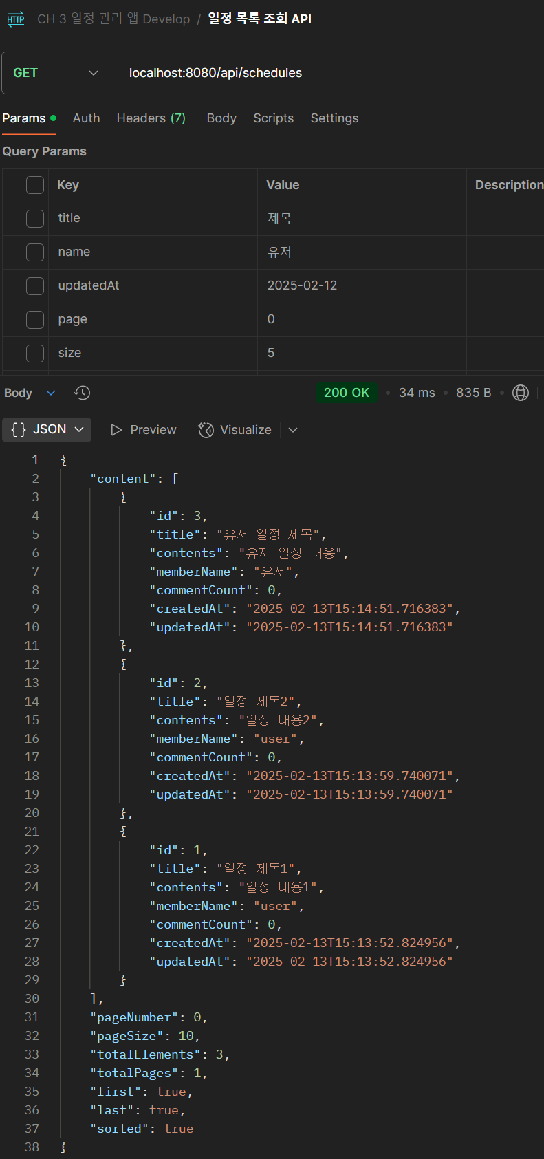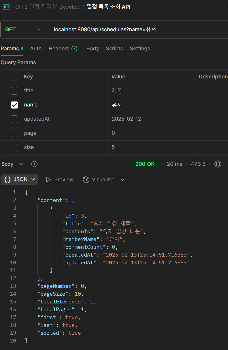 - 일정 제목과 작성자 이름 같은 경우는 LIKE로 조회