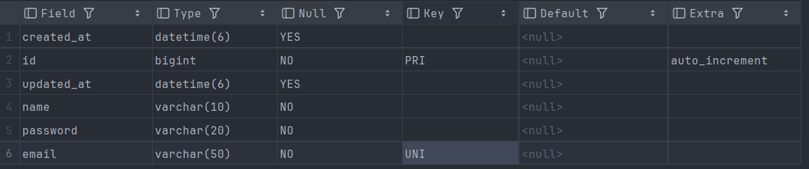Member 엔티티의 email은 로그인시 사용자를 체크하는 필드이기때문에 Unique 제약조건을 추가했습니다.