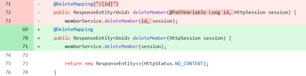 - PathVariable로 id를 전달하던것을 제거하고, session만 전달해서 현재 로그인한 사용자를 삭제하도록 수정