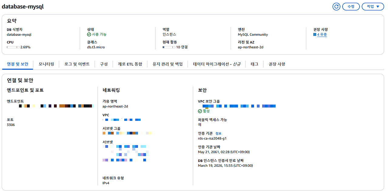 설정한 두 번째 보안 그룹 규칙(인스턴스 보안그룹)에 의해 EC2에서 RDS에 접속이 가능합니다.