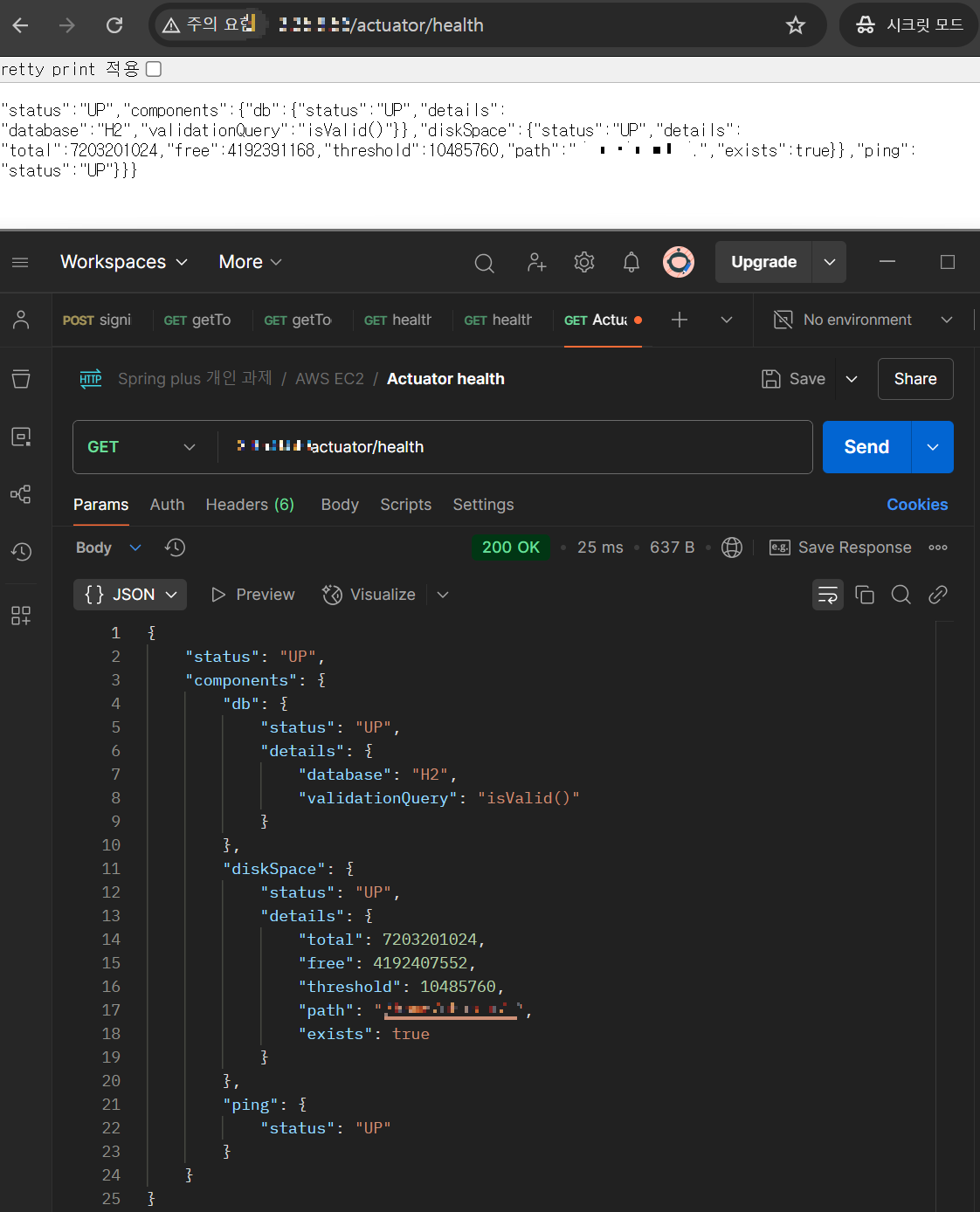 - 결과 - `<EC2 퍼블릭 IP>/actuator/health`