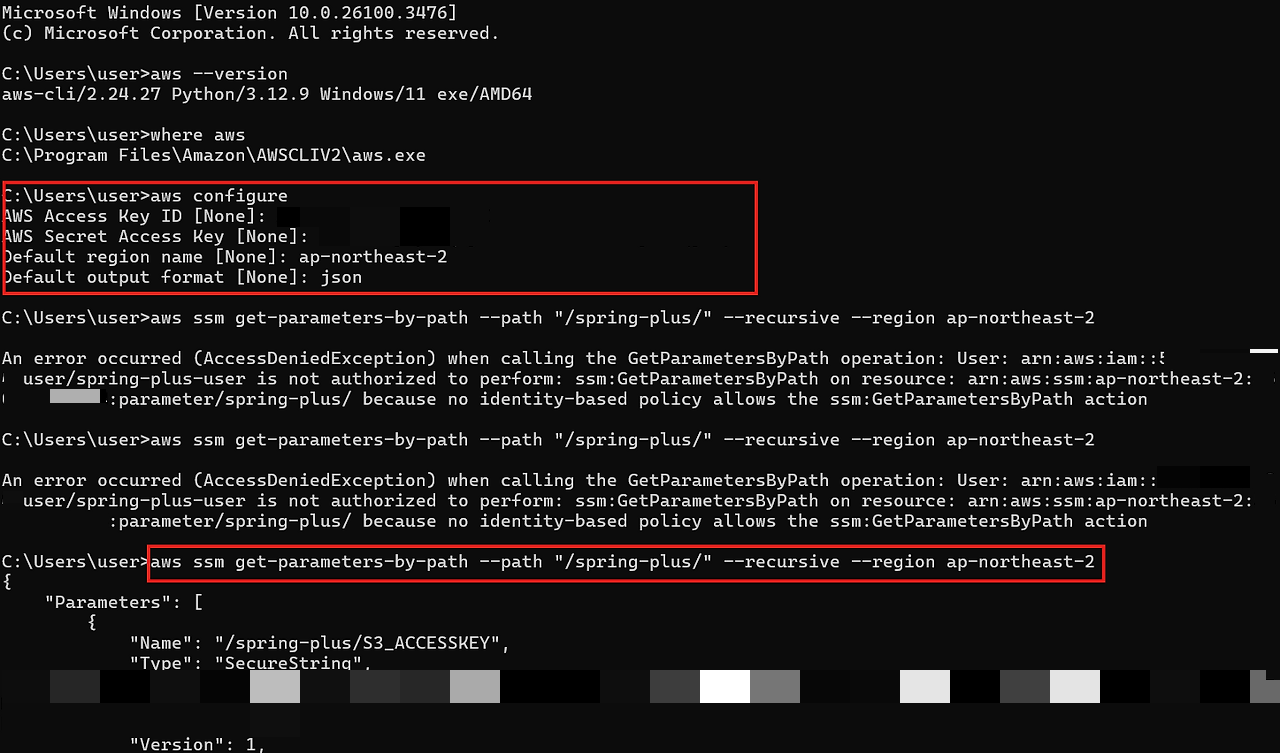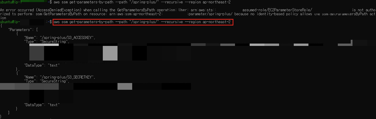 `aws ssm get-parameters-by-path` 명령어를 실행하여 환경변수를 정상적으로 가져오는지 확인