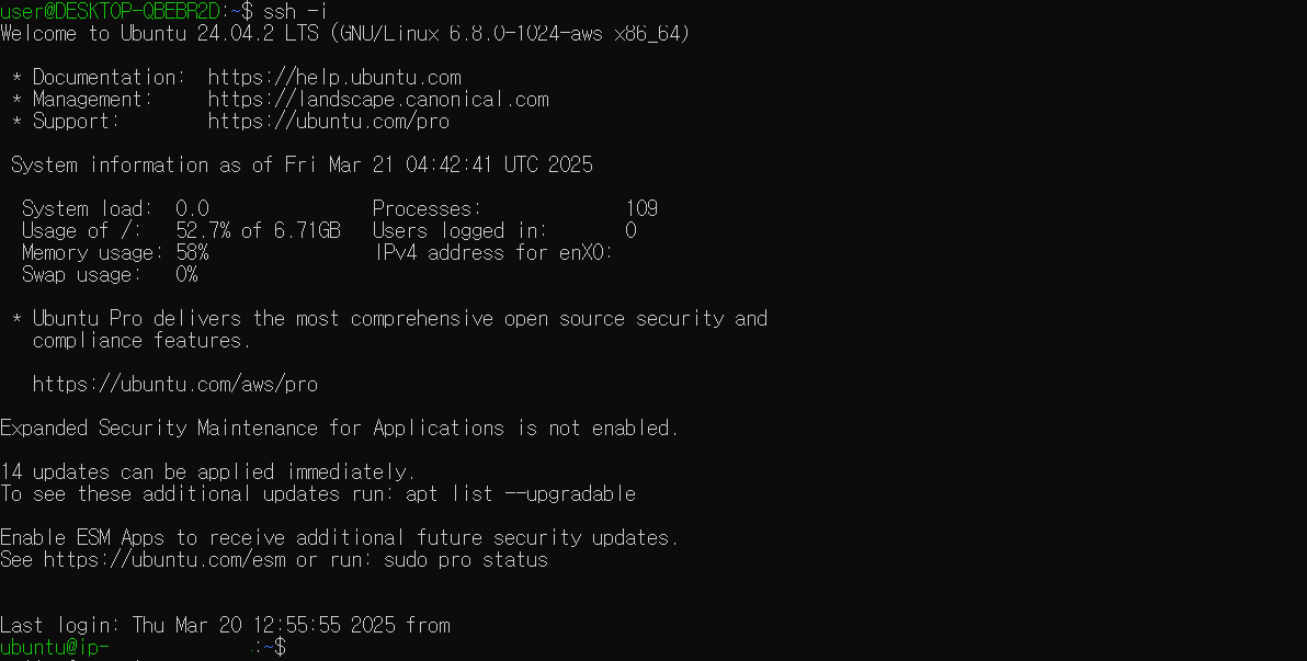 ssh -i "<SSH 키 파일>.pem" ubuntu@<EC2 퍼블릭 DNS>