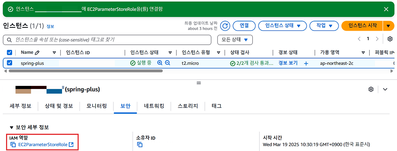 EC2 인스턴스가 AWS Systems Manager(Parameter Store)에 접근할 수 있도록 `EC2ParameterStoreRole`이라는 IAM 역할을 생성하고, 해당 역할을 EC2 인스턴스에 연결
