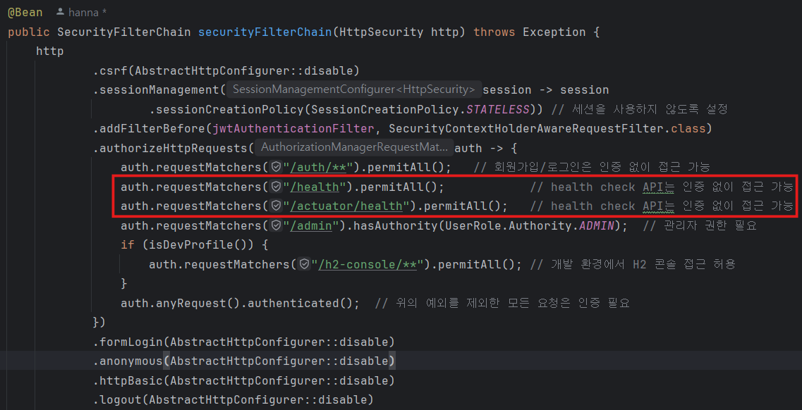 현재 서비스에서는 단순한 "서버 가동 여부 확인"만 필요하므로 `/health` API를 별도로 구현하는 것이 적절하다고 판단했습니다.