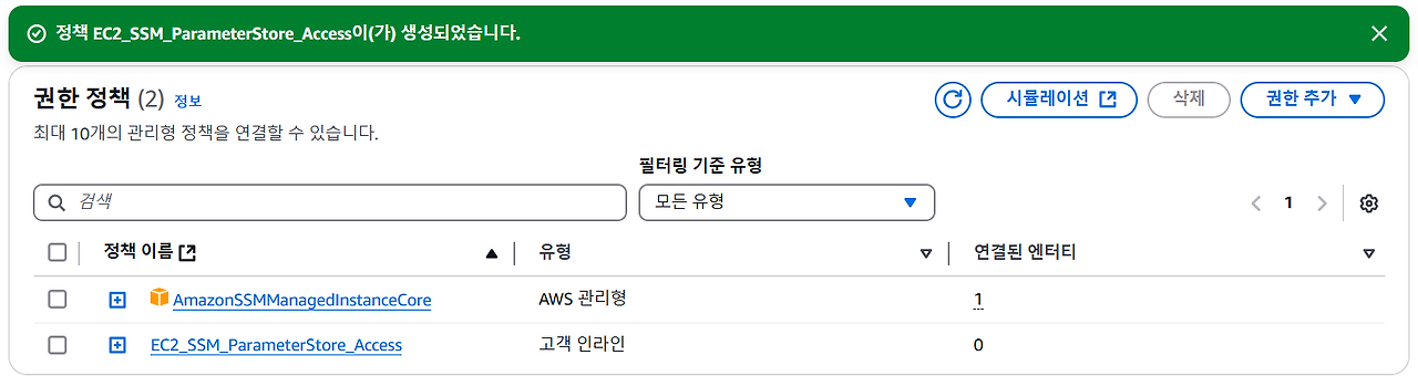 `EC2ParameterStoreRole` 역할에 `EC2_SSM_ParameterStore_Access`라는 사용자 지정 정책을 생성하고, EC2가 Parameter Store에 접근할 수 있도록 허용하는 권한을 부여