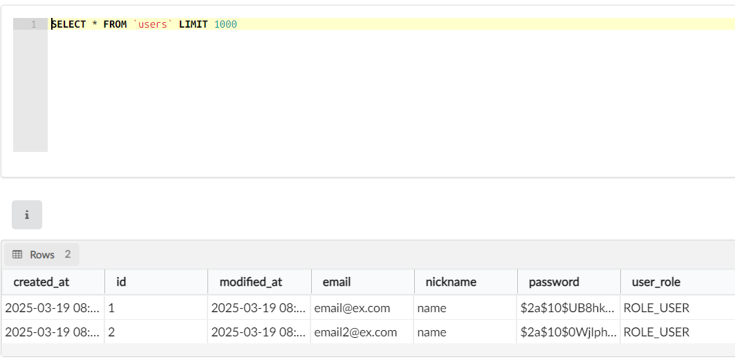 ➡️ insert 작업이 있는 api(예: 회원가입) 실행 후 RDS에 데이터가 잘 반영됐는지 확인