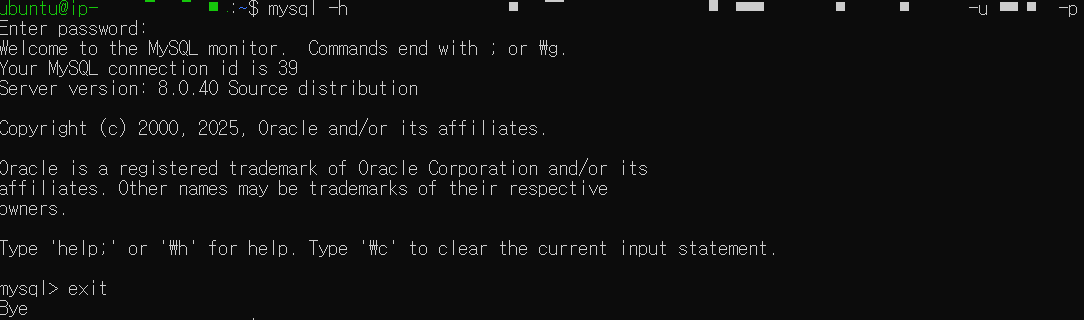 mysql -h <RDS 엔드포인트> -u <사용자명> -p