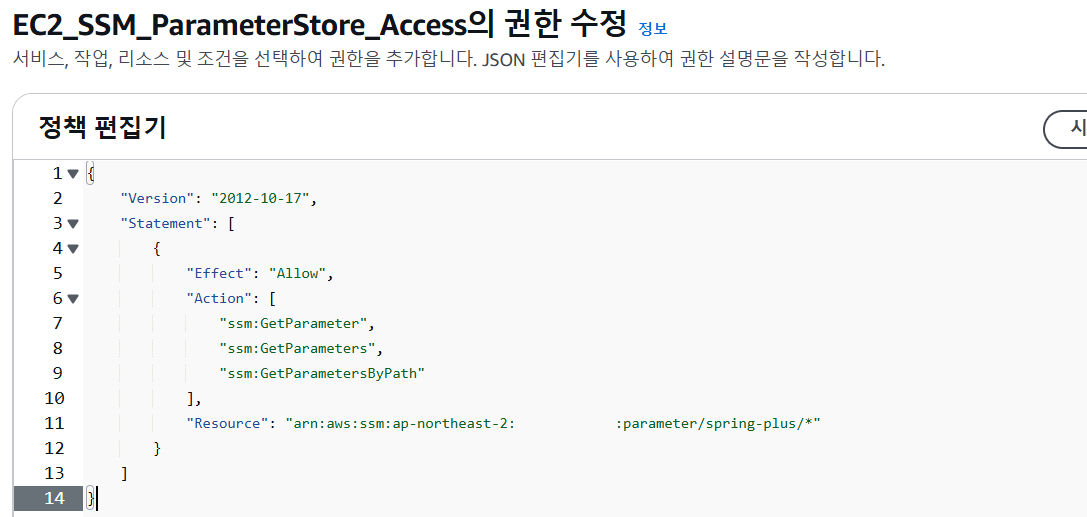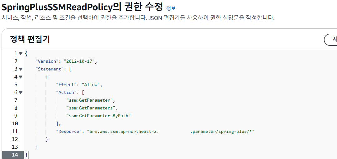 IAM 사용자 `spring-plus-user`에 Parameter Store에서 값을 읽을 수 있도록 `SpringPlusSSMReadPolicy`라는 사용자 지정 정책을 추가