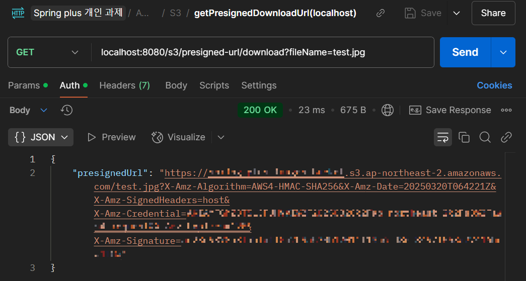 API를 구현하고, Local에서 실행했을 때는 위 캡쳐처럼 정상적으로 Presigned Url이 반환되는데,