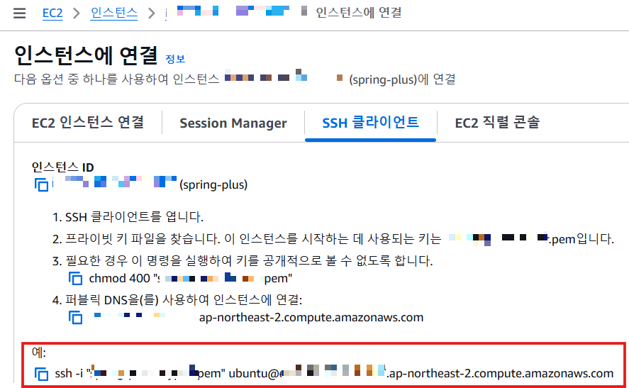 `EC2 > 인스턴스 > 생성한인스턴스 > 연결` 위치에서 SSH에 연결하는 방법을 확인할 수 있습니다.