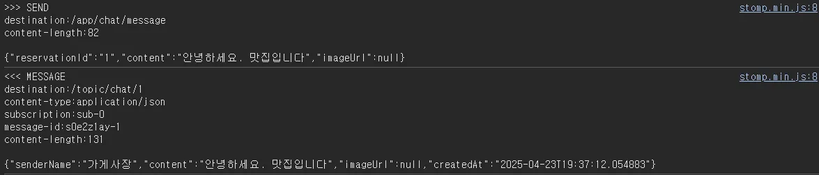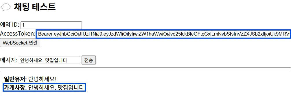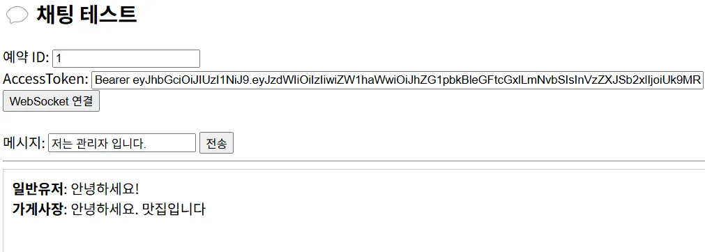 예약자와 사장님 각각이 WebSocket에 연결하고, 메시지를 주고받는 시나리오 테스트입니다.