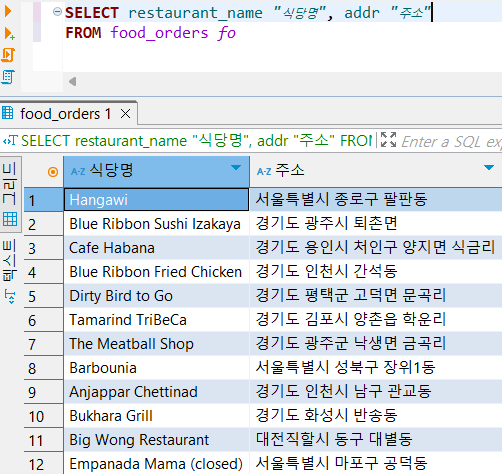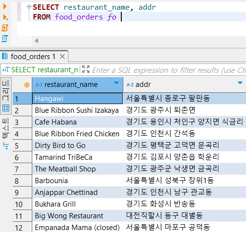 - food_orders 테이블에서 restaurant_name, addr 컬럼만 출력