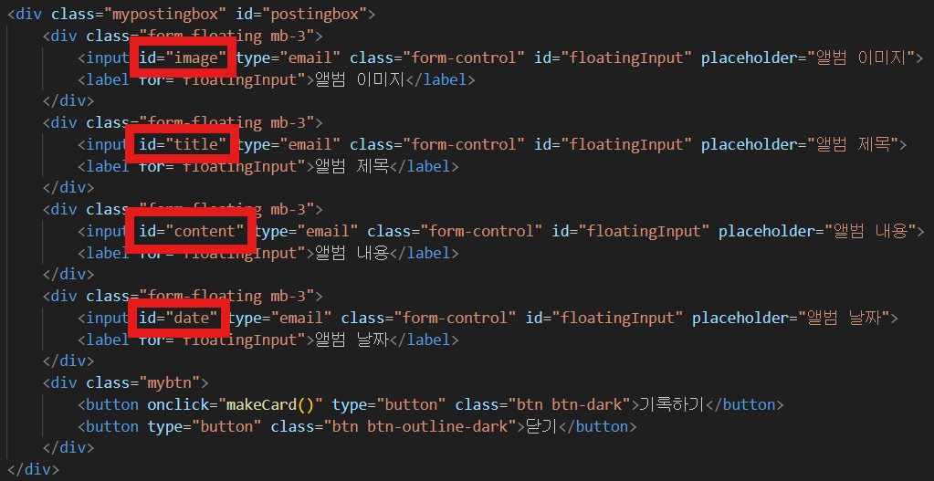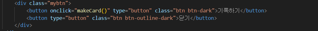 1) 기록하기 버튼에 onclick 함수 makeCard() 추가