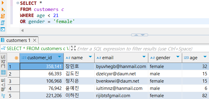 - customers 테이블에서 age가 21과 작거나, gender가 female인 경우만 출력