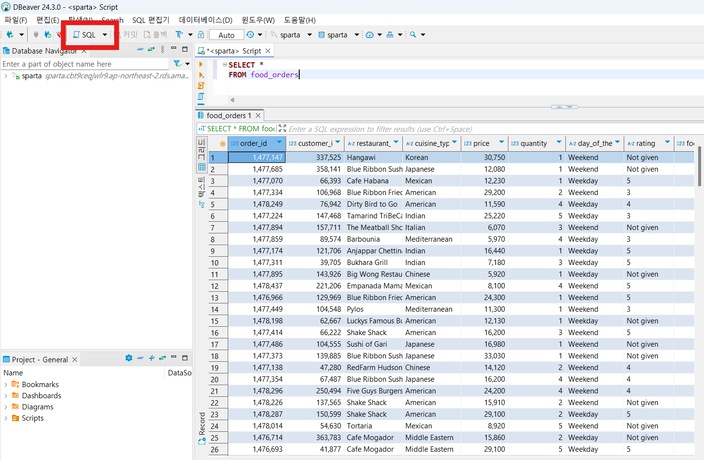서버를 연결했다면 SQL 버튼을 눌러 SQL 편집기를 띄우고, SQL 쿼리를 작성하여 실행할 수 있다.