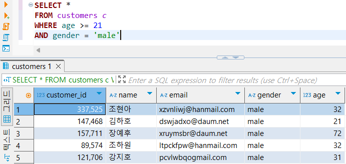 - customers 테이블에서 age가 21과 크거나 같고, gender가 male인 경우만 출력