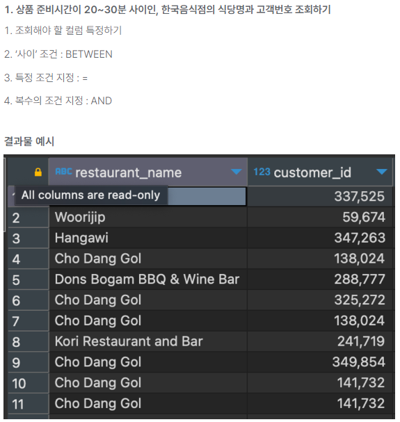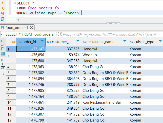 - food_orders 테이블에서 cuisine_type이 Korean인 경우만 출력