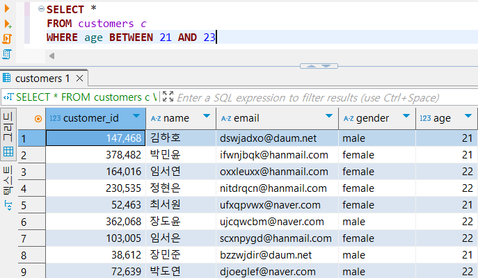 - customers 테이블에서 age가 21~23인 컬럼만 출력