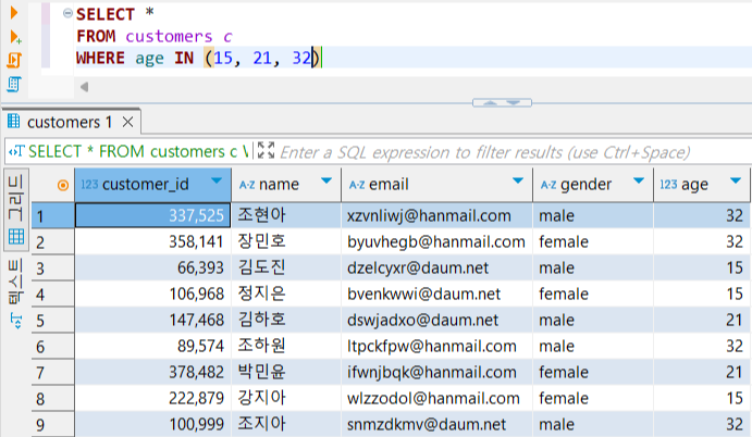 - customers테이블에서 age가 15, 21, 32인 컬럼만 출력