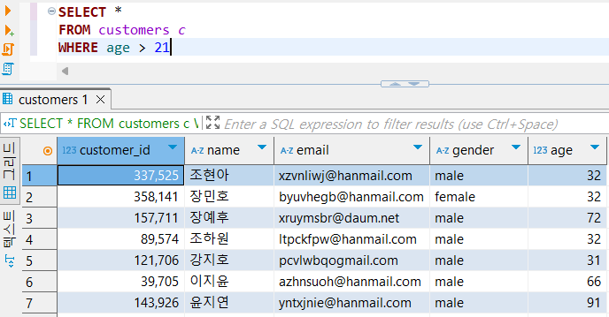 - customers 테이블에서 age가 21인 컬럼만 출력