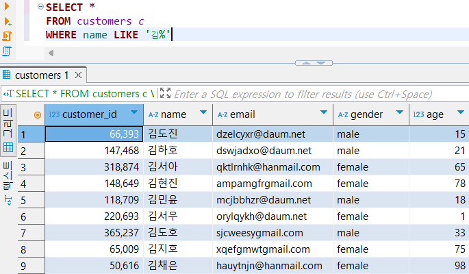 - customers테이블에서 name이 '김'으로 시작하는 컬럼만 출력