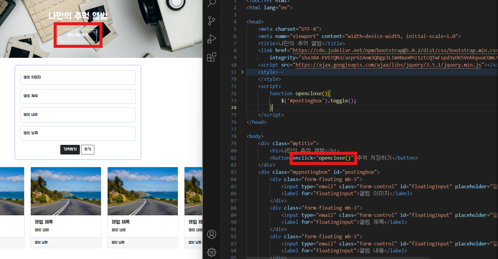 - 함수는 JQuery toggle을 이용해서 id(postingbox)를 지정한 div 영역이 클릭할 때마다 표시 또는 숨겨지도록 함.