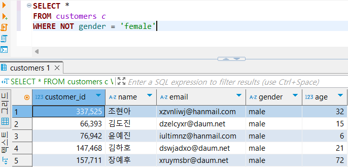 - customers테이블에서 gender가 female인 아닌 경우만 출력