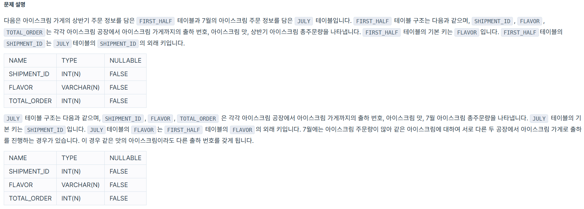 - 그런데, 위의 설명과 마찬가지로 `JULY`테이블과 `FIRST_HALF`테이블의 맛의 종류에는 차이가 없고,