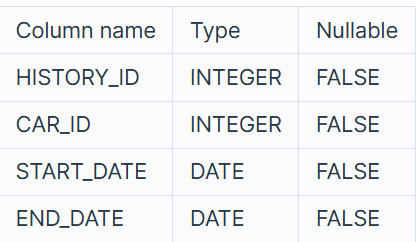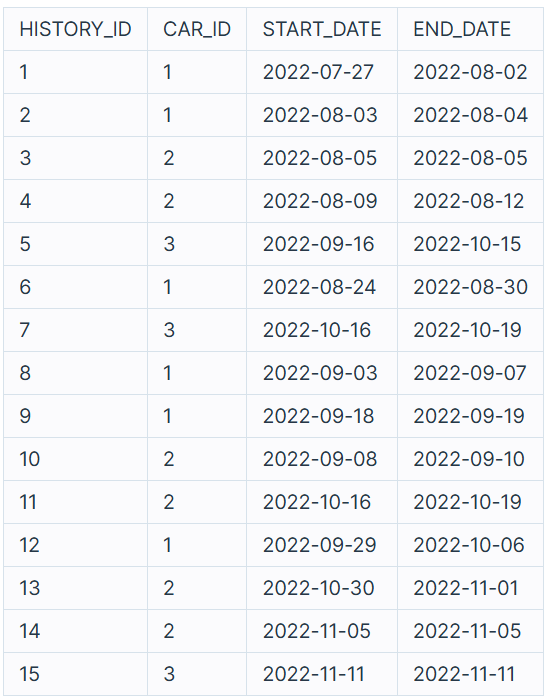 다음은 어느 자동차 대여 회사의 자동차 대여 기록 정보를 담은 CAR_RENTAL_COMPANY_RENTAL_HISTORY 테이블입니다. CAR_RENTAL_COMPANY_RENTAL_HISTORY 테이블은 아래와 같은 구조로 되어있으며, HISTORY_ID, CAR_ID, START_DATE, END_DATE 는 각각 자동차 대여 기록 ID, 자동차 ID, 대여 시작일, 대여 종료일을 나타냅니다.
