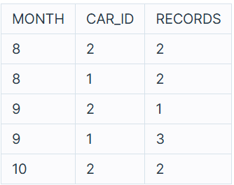 - `MONTH`에 오름차순, `CAR_ID`에 내림차순으로 정렬
